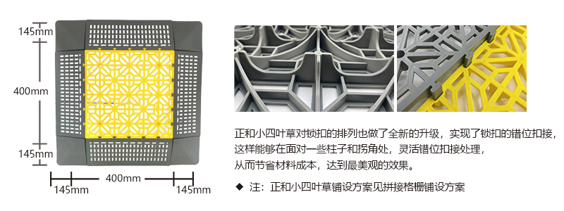 正和小四葉草采用通扣設(shè)計(jì),可以確保產(chǎn)品鋪設(shè)完成后在任何區(qū)域單獨(dú)取出,極大的方便了客戶后期局部清理泥沙等,給店面的日常衛(wèi)生維護(hù)提供了很好的基礎(chǔ)。