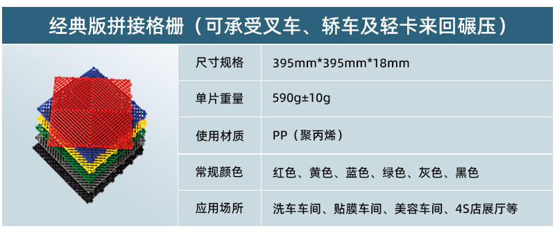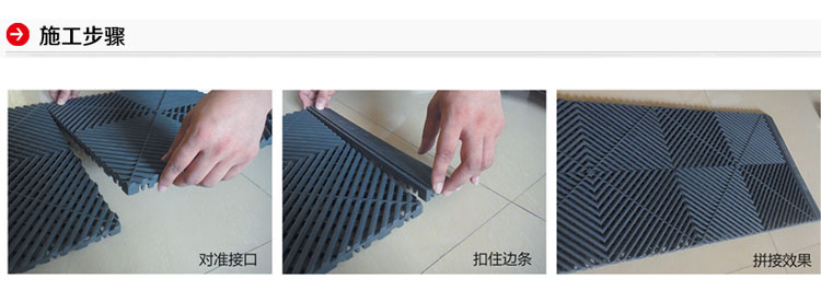 多功能拼接格柵具有高強(qiáng)承載、防水防油、色彩絢麗、施工簡(jiǎn)便、防水防污、無(wú)臭無(wú)毒等諸多優(yōu)點(diǎn),廣泛應(yīng)用于家庭陽(yáng)臺(tái)、汽車美容快修店、汽車4S店、洗浴中心、公共衛(wèi)生間、展覽展會(huì)、賓館酒店過(guò)道等場(chǎng)所。