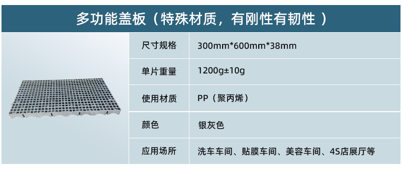 1、 超強(qiáng)耐壓,是唯一一款可以上大貨車,工程車,消防車等重型車輛的洗車格柵。 2、 可以懸空鋪設(shè),在跨度15CM以內(nèi)提供質(zhì)保。 3、特殊材質(zhì),有剛性有韌性。 4、外觀為小孔玻璃鋼款式,防高跟鞋。 5、平鋪后四周可以鋪瓷磚,應(yīng)用于高檔三膜店,金屬質(zhì)感,高檔豪華。 6、可以橫豎交叉鋪設(shè),鎖扣均可扣接。 7、 應(yīng)用廣泛,隨意搭配,美觀實(shí)用。