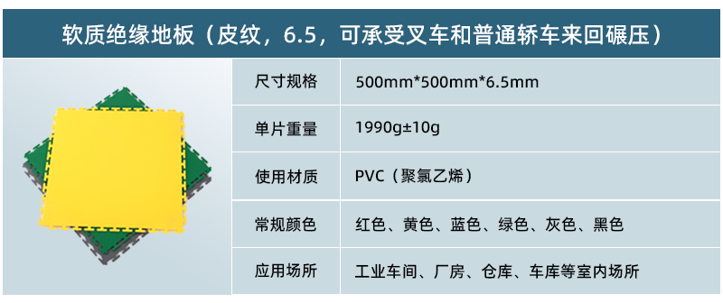 軟質(zhì)絕緣地板采用純新軟性PVC(聚氯乙烯)生產(chǎn)而成,具有防滑、防油、靜音、抗沖擊、高承載等特點(diǎn),可以快捷安裝在任何現(xiàn)有的基板,包括木材,混凝土,環(huán)氧樹(shù)脂,瓷磚,水磨石等,廣泛應(yīng)用于車(chē)間廠房地面、倉(cāng)庫(kù)地面、車(chē)庫(kù)地面、健身房、展廳等場(chǎng)所。